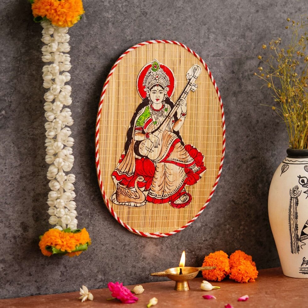 Oval Shaped Design Bamboo Hand Crafted Wall Hangings Of Godess Sarwasti Ji For Home Decor