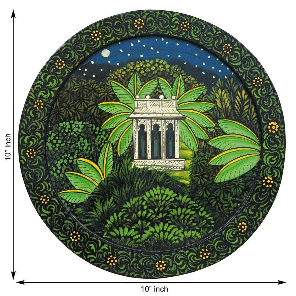 This hand-painted pichwai features a unique and captivating scene of a house nestled within a lush jungle. The intricate details and vibrant colors bring this artwork to life. Perfect for adding a touch of cultural intrigue to your home or as a gift for someone who appreciates unique and exotic art.