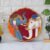 A beautiful pichwai artwork showcasing three cows in a perfect circle. The cows are adorned with intricate jewelry and stand on a wooden plate with a colorful floral border.