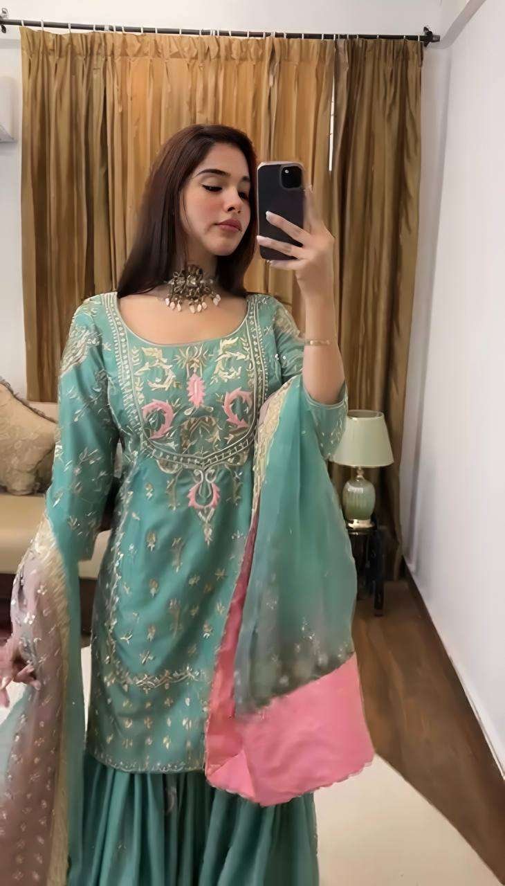 Women’s Chinon Silk Heavy Embroidery Straight Kurta With Sharara and Dupatta set